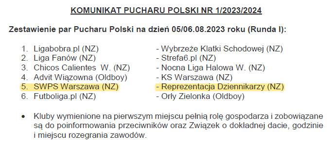 Kapitan rywali Stanisław Burdon napisał dla nas kilka słów o swoim zespole: „Jesteśmy drużyną złożoną z pracowników, byłych pracowników i przyjaciół Uniwersytetu SWPS. W Pucharze Polski występujemy piąty raz z rzędu, niestety jak dotąd bez sukcesów. Zawsze odpadaliśmy w pierwszej rundzie. Od kilku lat gramy rekreacyjnie w swoim gronie, a występy w Pucharze to nasza jedyna coroczna próba rywalizacji „na zewnątrz”. Czasami zdarzy nam się zagrać jakiś sparing, ale nie gramy w żadnej lidze. Niektórzy z nas grali w klubach w czasach juniorskich, nie ma się czym pochwalić. Spotkamy się na boisku przy ulicy Aleksandra Fleminga 2, ponieważ na nim właśnie gramy. Zaczęliśmy właśnie na Białołęce, ponieważ syn jednego z kolegów tam trenował„.