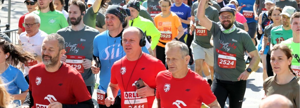 Najtrudniejszym momentem dla Mariusza był powrót na most: Jakiś sadysta wymyślił podbieg „ślimakiem” na „Poniatowszczaka” na 20 km , ale widok Narodowego po drugiej stronie rzeki dodawał sił. Ostatni kilometr to czysta przyjemność, na moście, z wiaterkiem w plecy i widokiem na metę w oddali. Chciałem pobiec 2:30, a najlepiej średnio 7 min/km, czyli 2:27. Udało się lepiej, rekord życiowy poprawiony o 6 minut, wynik 2:24:46 cieszył mnie przez pół dnia, dopóki w internecie nie sprawdziłem wyników kolegów. W przyszłym roku złamię 2:20, a przed pięćdziesiątymi urodzinami zejdę poniżej 2 godzin 🙂 Kolano bolało znacznie mniej niż przy grze w piłce, ale zdecydowanie wolę być piłkarzem, niż biegaczem.
