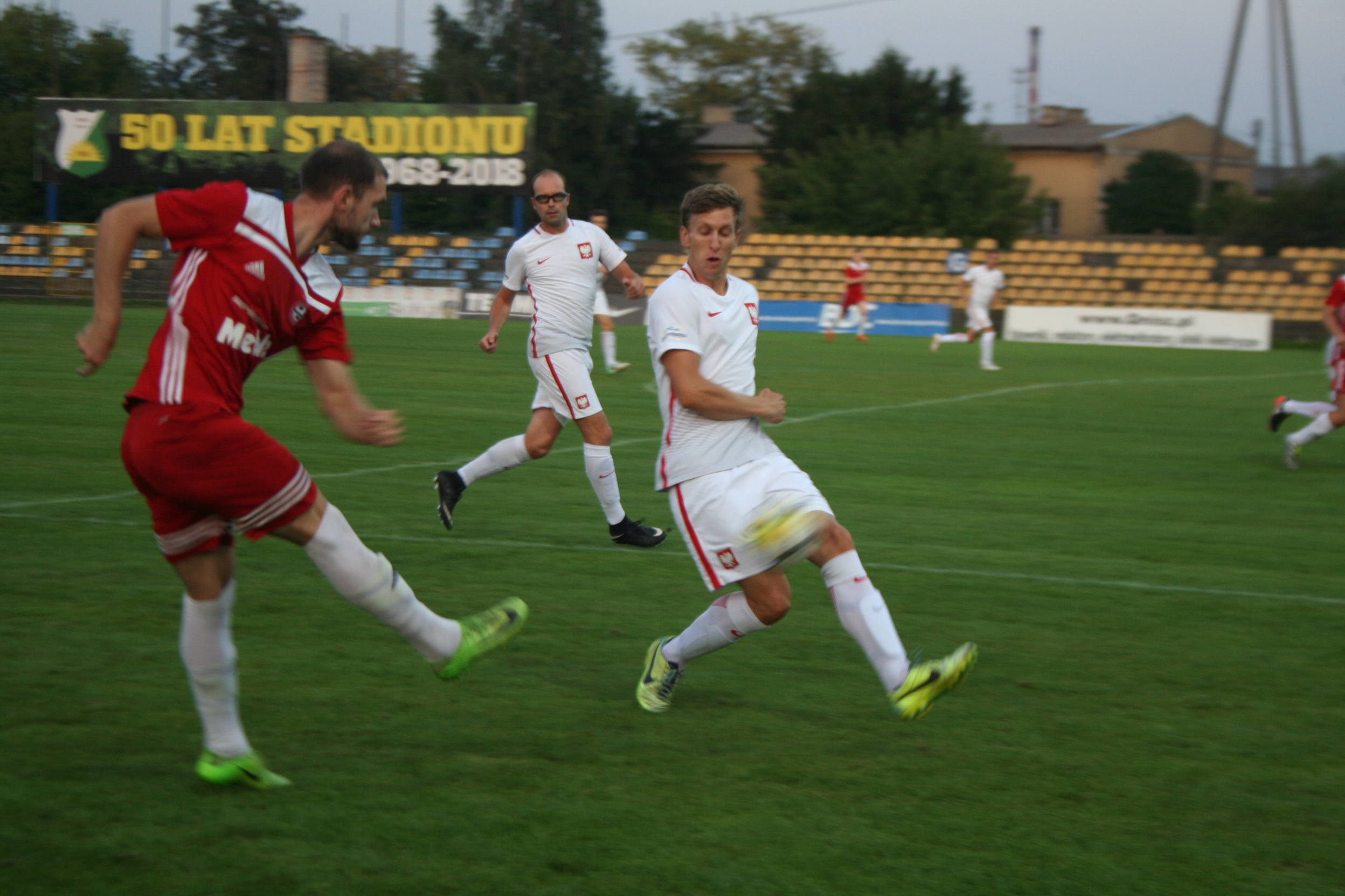 Cezary Olbrycht bardzo dobrze wszedł w mecz na lewej stronie obrony. Już przy pierwszym długim podaniu pokazał młodszemu przeciwnikowi, że nie będzie mógł tak łatwo sobie pohasać. I wszystko szło dobrze do siódmej minuty, kiedy niedokładne zagranie Czarka do Grzegorza Jędrzejewskiego przejął rywal i bez trudu trafił do bramki.