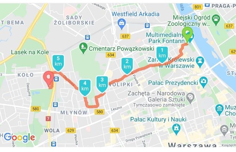 Góra Gnojna – Kopiec Moczydłowski, czyli 5,5 km po mieście (po drodze Nowe Miasto, cała długość ulicy Anielewicza, Powązki, Park Moczydło). Wszystko po płaskim, tylko na koniec mocny podbieg i… wcale nie meta, bo przecież trzeba jeszcze wrócić. W sumie będzie ponad 11 km