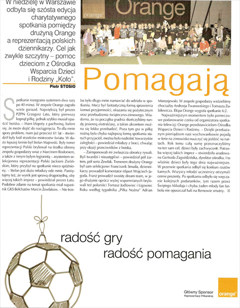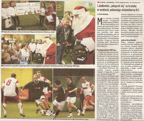– Dzięki meczom charytatywnym, które rozgrywamy z dziennikarzami zawsze przed Świętami, do dzieci z ośrodka „Koło” trafiło już niemal 100 tys. zł. Pieniążki pozwalają m.in. na sfinansowanie wyjazdów dzieci na zimowiska – mówił Wojciech Jabczyński, kapitan zespołu Orange i Przyjaciele oraz rzecznik Grupy TP. Poniżej relacja „Piłki Nożnej”.